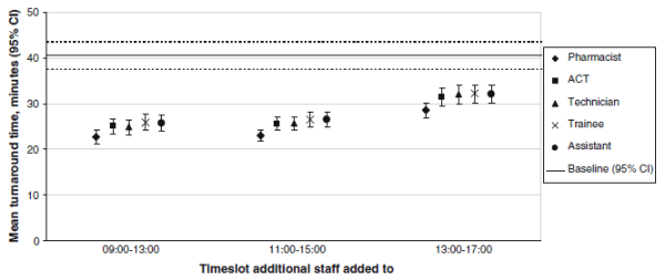 They were surprised that adding an assistant, who has very few competencies that allow for process improvement, made almost as large a difference as any of the other three non-pharmacist staff. Deeper invesitgations revealed two possibilities. Allowing the assistant to do labeling freed more skilled workers to do tasts which did influence throughput, or that the assistant’s main task, assembly, may be a larger bottleneck than had been supposed.